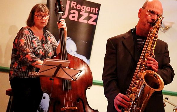 Paula Robinson and Andy Nicholls Paula Robinson (bass) and Andy Nicholls (Sax), at the Regent Jazz Club, 4th September 2018. Photo by Kevin Gaughan.